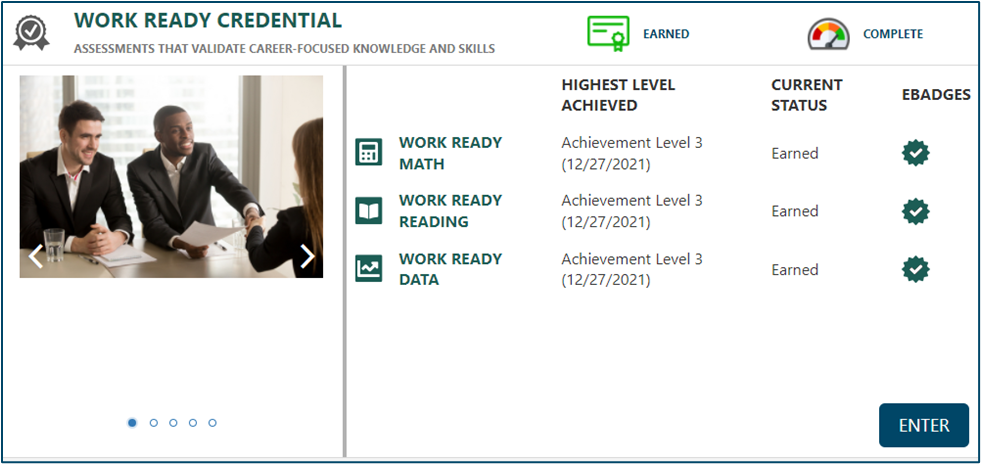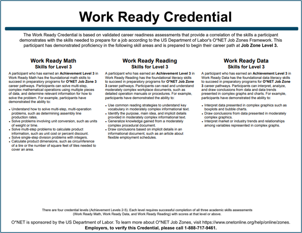 The Work Ready Credential is a workforce, education, and development tool comprised of three proctored assessments: Work Ready Math, Work Ready Reading, and Work Ready Data. There are four credential levels (Achievement Levels 2-5). Each level requires successful completion of all three academic skills assessments with scores at that level or above. Learners can achieve a Level 1 eBadge, but must achieve at least Level 2 on all three assessments to earn a credential.