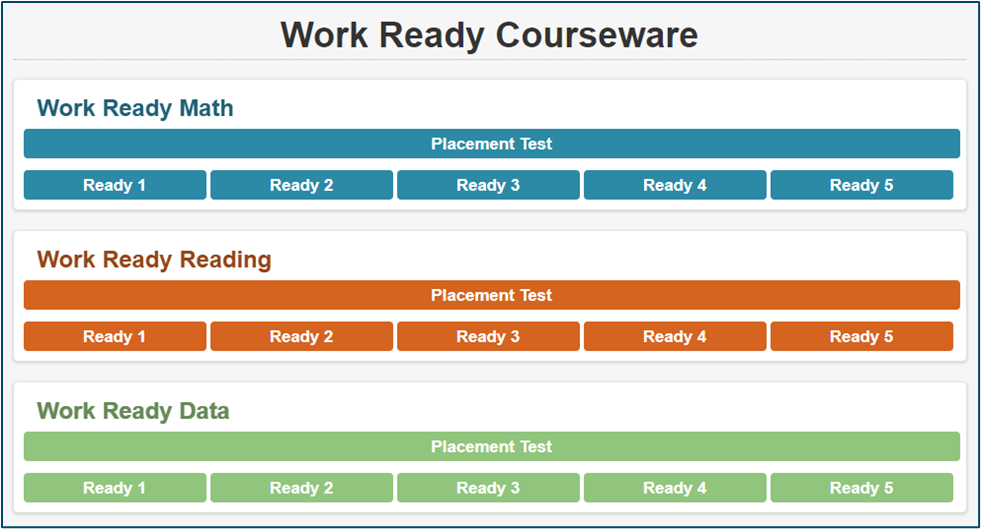 Work Ready Courseware is a self-paced course in which you will develop the foundational workplace skills required for most jobs from entry level to professional. It is made up of three modules: Work Ready Math, Work Ready Reading, and Work Ready Data.