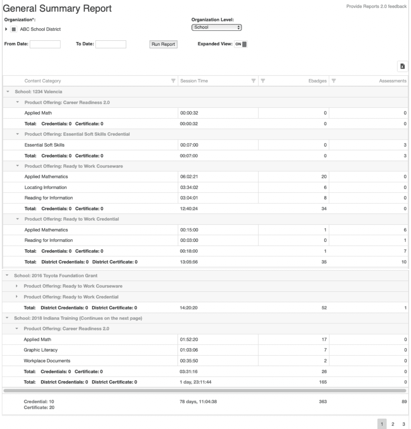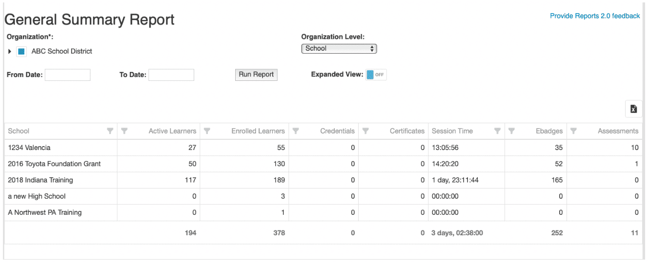 The facilitator or administration must choose one or more organizations, then they can optionally choose what organization level they want to see (e.g. by school, by district, by program, by location…), then they can optionally select a date range. If they do not choose an organization level the report will show the highest level. Once all selections are made, click Run Report. Click the Excel symbol in the upper left of the table to export the data to Excel. Use the Expanded View toggle to see more details.