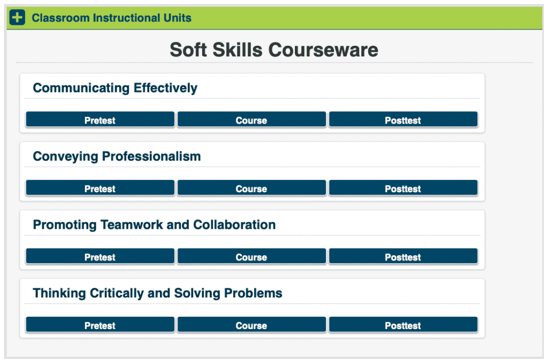 Soft Skills Courseware has been updated to include some new content and a new user experience. In addition, the printable Instructional Units have been added to the Soft Skills Courseware landing page for non-learners to access.