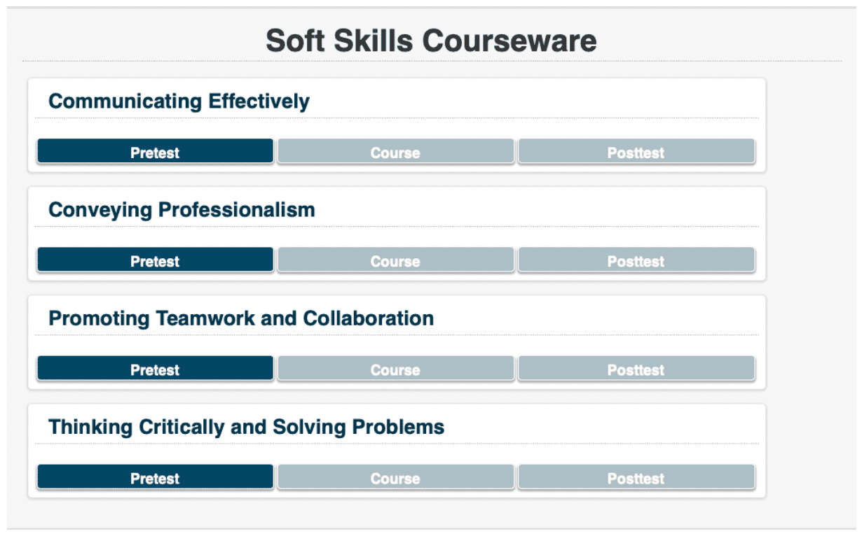 Learners will see the four modules each presented with a Pretest, Course, and Posttest button. The learner must complete the pretest for a module in order to unlock the course. The learner must complete the course in order to unlock the posttest. The learner must pass the posttest with at least an 80% to earn the eBadge. Once the learner earns all four eBadges, he/she will earn the Soft Skills Courseware Certificate of Completion.