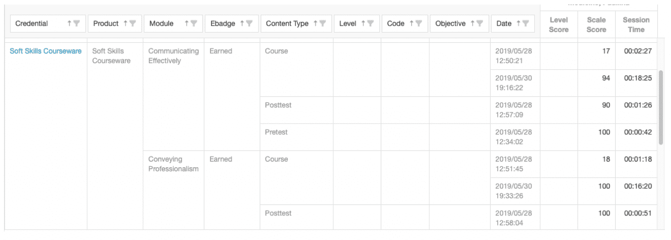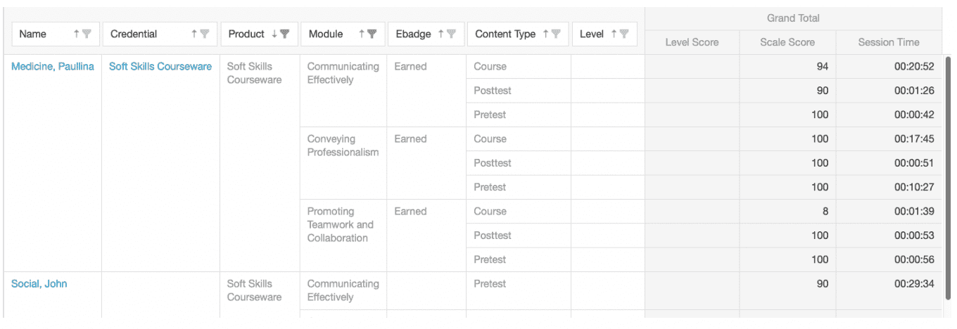 Scores will be captured and reported for each module’s pretest, course, and posttest. The course score will reflect the average score of all exercises in the course.