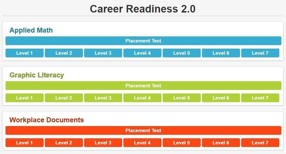 Career Readiness 2.0 is a self-paced course in which you will develop the foundational workplace skills required for most jobs from entry level to professional. It is made up of three modules: Applied Math, Graphic Literacy, and Workplace Documents. Each module contains a placement test and seven course levels, each with a pretest, instructional content, practice exercises, and posttest. You will automatically be placed in the appropriate level based on your placement test results. Score at least 80 percent on the posttest to earn an eBadge and unlock the next level of training.