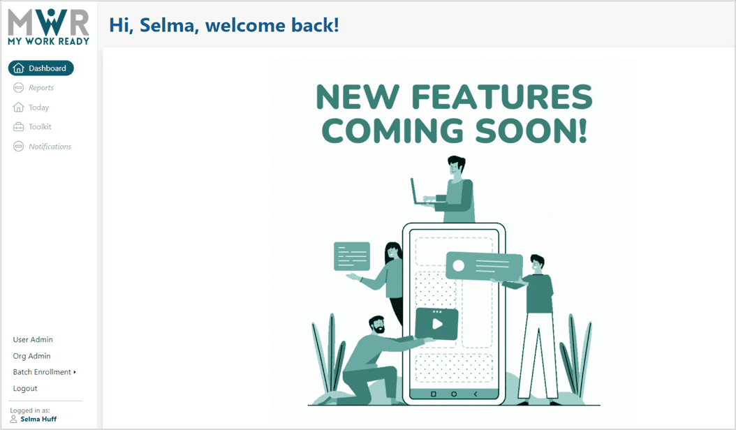 While the non-learner dashboard charts, reports, and notifications are still under development, non-learners are able to access some My Work Ready features. They can access the tools User Admin, Org Admin and Batch Enrollment from the menu. They can also access the Toolkit and Today screens which provide insight into the learner view and experience.