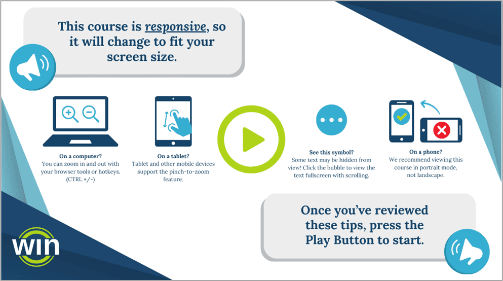 - When on a mobile device, on question slides in the placement, posttests, and practice exercises audio will not play unless it is activated on the intro slide. This will be addressed in a future release.