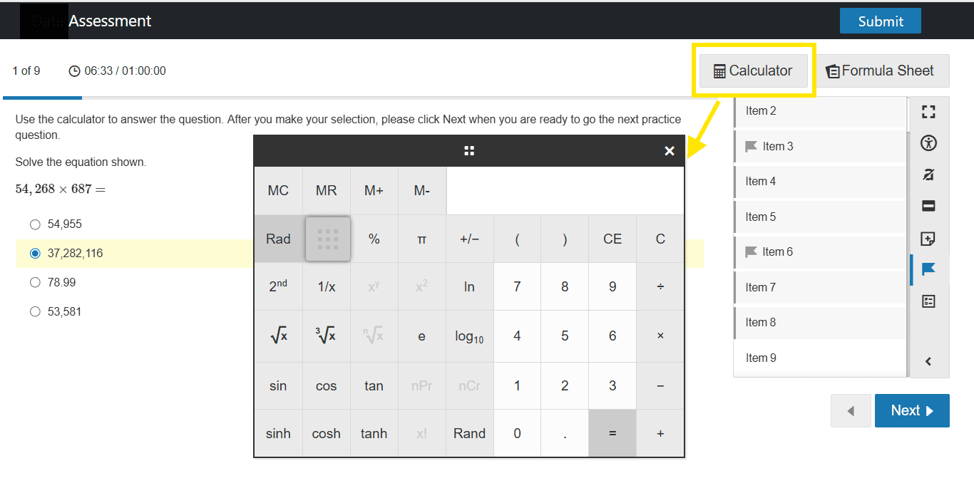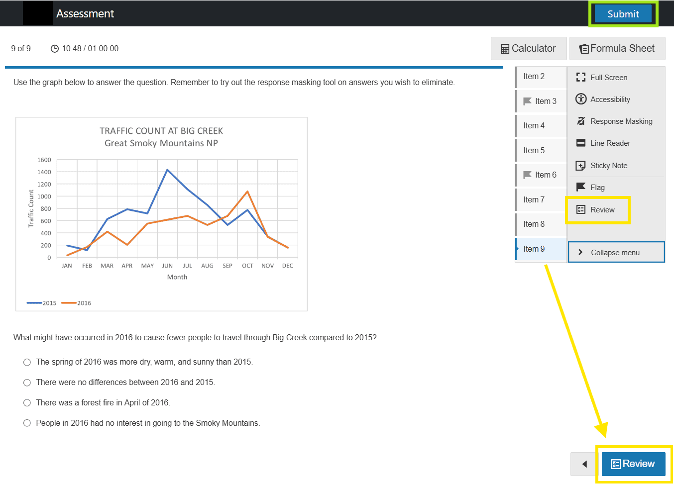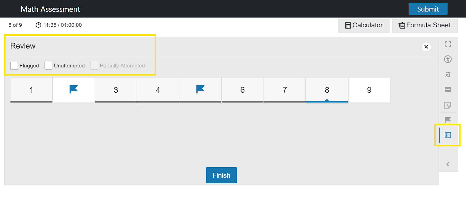 Learners can click “Review” in the tools panel at any time and see their current progress (i.e. completed items, flagged items, unattempted items). In addition, when a learner answers the final item on an assessment a “Review” button appears in place of the “Next” button. Students have the option to select “Review” and double check their work before submitting, or they can skip this step and simply select “Submit” in the top right corner of the assessment. The latter still includes a warning about double checking items before submitting the assessment.