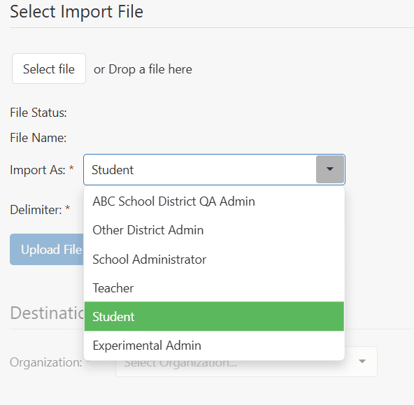 Users now have the ability to batch enroll nonlearners. Batch files for nonlearners must be a single file for each nonlearner role you wish to import (ie; a file for Teachers, a file for School Administrators, et cetera). Select the role you want to import the nonlearners into from the “Import As” dropdown from the Import File page.
