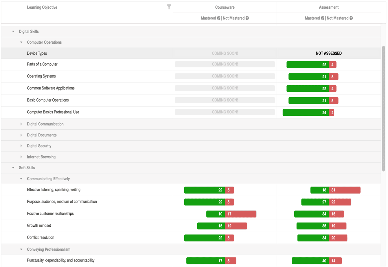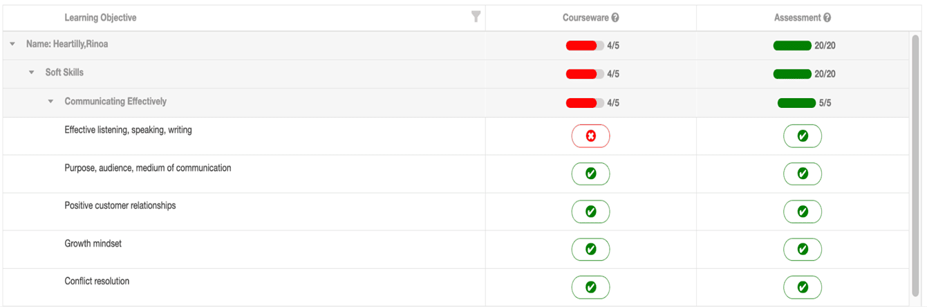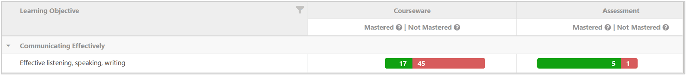 In this example, 17 learners mastered the objective “Effective listening, speaking, writing,” and 45 learners did not master the objective in the Soft Skills Courseware. In the Soft Skills Assessment, 5 learners mastered the objective and 1 did not.