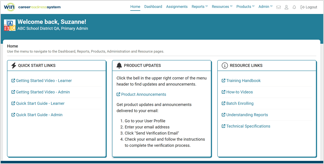 Non-learners, such as instructors, proctors and administrators, will land on a new Home page once logged in. The new Home page features Quick Start Guides, Product Updates, and frequently accessed Resources. The Dashboard is still available by selecting Dashboard from the menu.