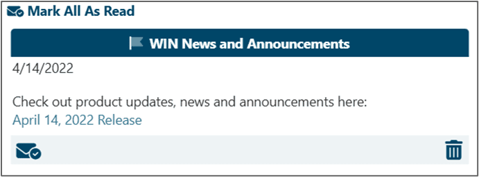 - When clicked, the user will see their notifications, with unread messages on top. The user can mark the message as read by clicking the blue envelope with the checkmark, or delete the message by clicking the trash can. The user can mark all messages as read by clicking Mark All As Read at the top of the notification window.