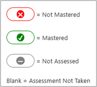Not Assessed = there are objectives that may be taught and assessed in the courseware but not assessed in the proctored assessment. This is currently true of Digital Skills Assessment. If a learning objective is not assessed the grey icon will be displayed.