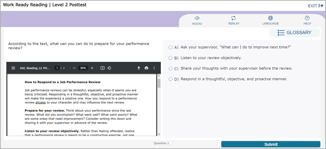 Every ASC module now has a Glossary. Work Ready Math has a Formula Sheet and a Glossary, which includes Mathematical Key Words.