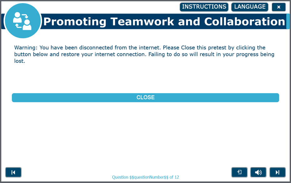 - Soft Skills Courseware lost internet mitigation – If a learner loses internet connection in the middle of a Soft Skills Courseware pretest or posttest, a message will appear letting the learner know and instructing them to close out, reconnect, and return. They will be able to resume where they left off.
