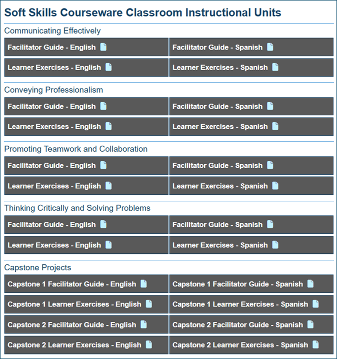 Soft Skills Offline Materials, available for Soft Skills facilitators under the Resources dropdown, are now available in Spanish.