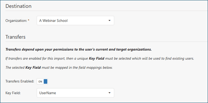 After uploading the enrollment file, the admin will select the target organization for the enrollees. If the admin would like to enable transfers for students in the file, they will toggle Transfers Enabled to On and then select the Key Field that the student will be verified against (e.g. username, unique identifier, or other unique custom field). This ensures that the student identified for transfer is the intended student.
