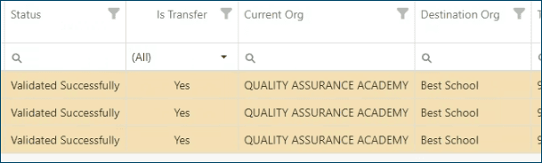 In the verification table, they will see three new columns: Is Transer, Current Org, and Destination Org with information about the student targeted for transfer.
