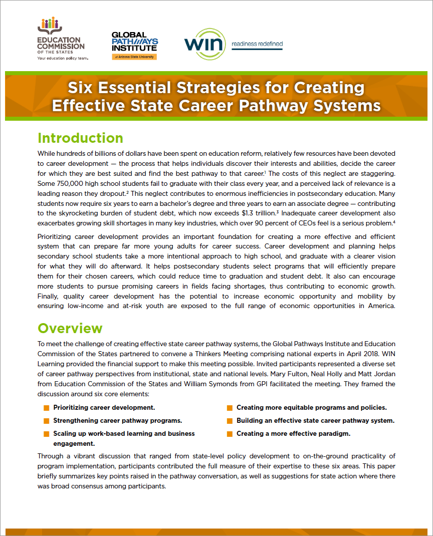 The Global Pathways Institute and the Education Commission of the States partnered to convene a diverse set of career pathway perspectives from institutional, state, and national levels. This collaborative effort, in partnership and financial support from WIN Learning, has led to an initial brief that will contribute to the growing efforts in many states to build more effective career pathway systems. The outcome of the initial dialogue has framed the discussion around six essential strategies.
