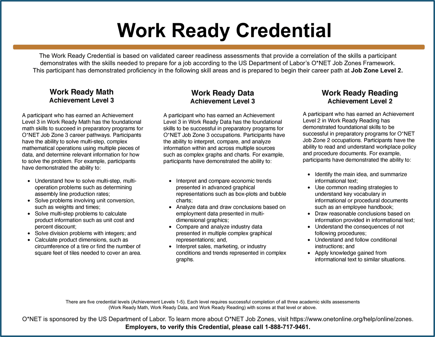 Work Ready Courseware provides participants with an initial placement to identify current skill levels in each of the modules, and to identify further training and education along their career path. The participant will enter a module at a level appropriate for their skills and then progresses at their own pace based on their performance on the placement test. The Work Ready Courseware provide participants with a personalized profile of how prepared they are for the Work Ready Assessment.